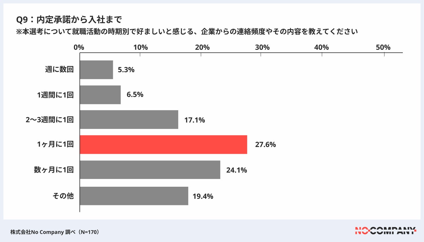 企業の人事部門向けに採用広報(採用マーケティング)支援を行う株式会社No Company(本社:東京都港区、代表取締役:秋山真)は、採用活動の早期化、長期化に伴い重要性が増している採用活動における企業から学生への適切な連絡について、就職活動中に学生が感じた企業からの良い、あるいは悪い連絡頻度、内容、方法を調査で明らかにし、結果を発表致します。