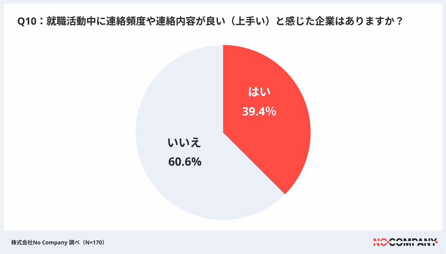「就職活動中に連絡頻度や連絡内容が良い(上手い)と感じた企業はありましたか?」の質問については、39.4%が「はい」と回答した。「はい」と回答した学生に、良かった点の具体的な内容を聞くと以下のような回答が多く見られました。