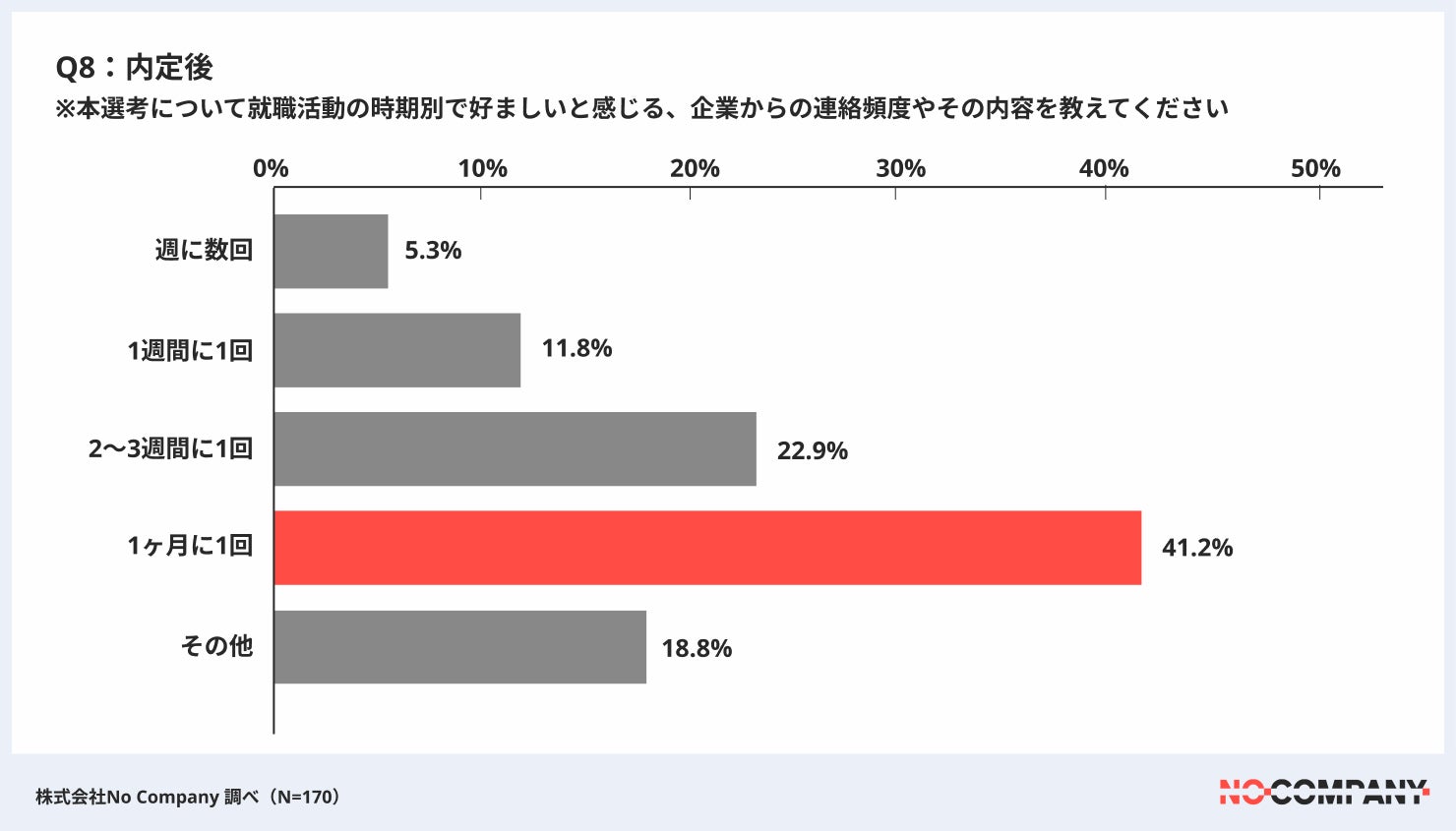 自身が選考を受けることを決めた選考中の企業からは、週1回など頻繁に連絡が欲しいと考えている一方、エントリーするかどうか迷っている、内定承諾をするかどうか迷っている場合の連絡は月に1回程度にして欲しいということです。自身にとって必要な情報はすぐに欲しいけれど、自分からの回答は静かに待っていて欲しいという気持ちの表れだと考えられます。